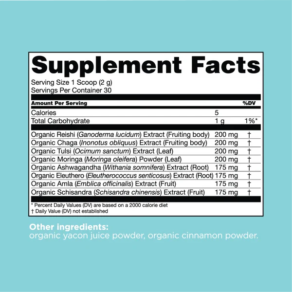 De blend is volledig biologisch gecertificeerd, cafeïnevrij, vegan, en vrij van toegevoegde suikers, smaakstoffen, gluten, soja, zuivel, ei, vis en schaaldieren. Door de neutrale smaak en veelzijdigheid is het een toegankelijke manier om een mix van planten- en paddenstoelingrediënten aan je voedingspatroon toe te voegen.
