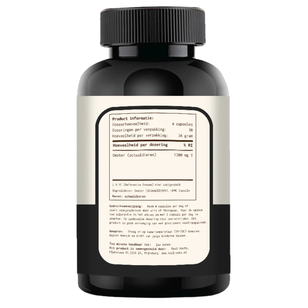 Verse oesters zijn niet voor iedereen praktisch of dagelijks beschikbaar, terwijl veel mensen juist geïnteresseerd zijn in hun bijzondere voedingsprofiel. Met Real Roots Oester Capsules kun je oester als compleet voedingsmiddel gemakkelijk opnemen in je voedingspatroon, zonder schelpen te openen of rekening te houden met smaak. De oesters zijn afkomstig uit de Ierse kustwateren en worden gevriesdroogd zonder chemische bewerking. Per dagdosering zijn de gehaltes aan zink, koper en vitamine B12 analytisch bepaald, zodat je precies weet wat je per 4 capsules binnenkrijgt. Het product sluit aan bij een ingrediënt-first benadering, waarin transparantie en eenvoud centraal staan.