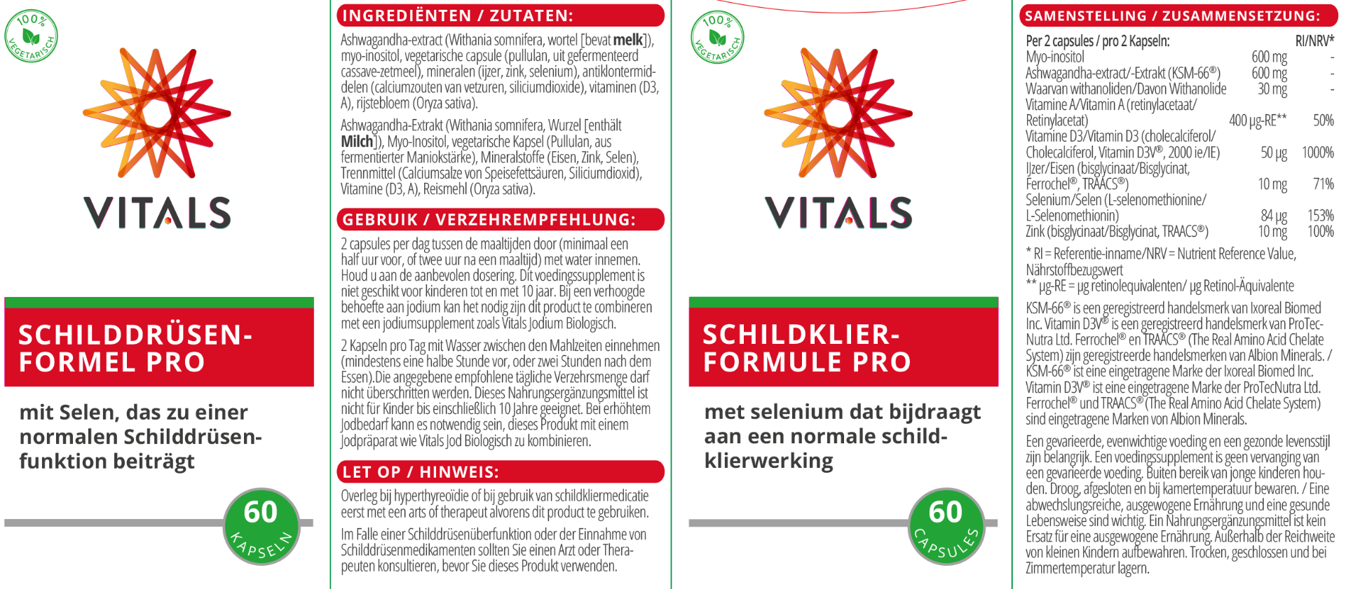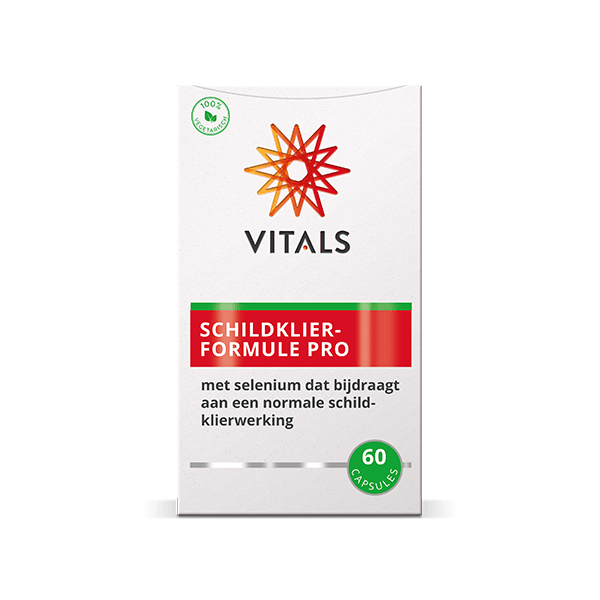 Schildklierformule Pro van Vitals bevat een slimme en goed onderbouwde selectie van nutriënten, met als een van de hoofdrolspelers selenium. Van dit spoorelement is bekend dat de inname met de voeding de afgelopen decennia onder druk is komen te staan. Dit terwijl selenium wél een essentiële rol vervult in onder meer het goed functioneren van onze schildklier. Van alle weefsels in het menselijk lichaam heeft de schildklier het hoogste seleniumgehalte en mede daarom is het noodzakelijk om voor een voldoende aanvoer van selenium te blijven zorgen. Ons lichaam kan spoorelementen zoals selenium immers niet zelf aanmaken. Andere nutriënten in Schildklierformule Pro zijn myo-inositol, vitamine A, een ruime dosering vitamine D3 uit plantaardige bron en twee uitstekend opneembare, aminozuurgebonden vormen van ijzer en zink. Aangevuld met een bijzonder werkzaam extract uit ashwagandha-wortel met de merknaam KSM-66®.